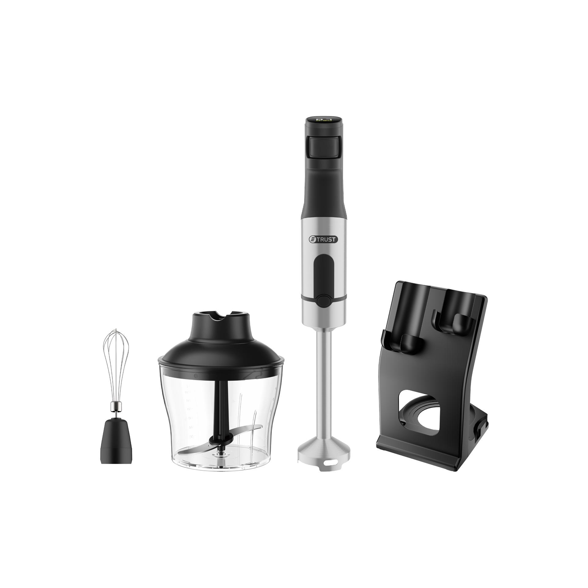 SpecificationsMulti Speed with soft-touch botton.LED Screen.• Stanless steel.• Easy to use.Accsesories: Wisk, chopper & stand.Voltage: 220-240V~50/60Hz. 1200W.