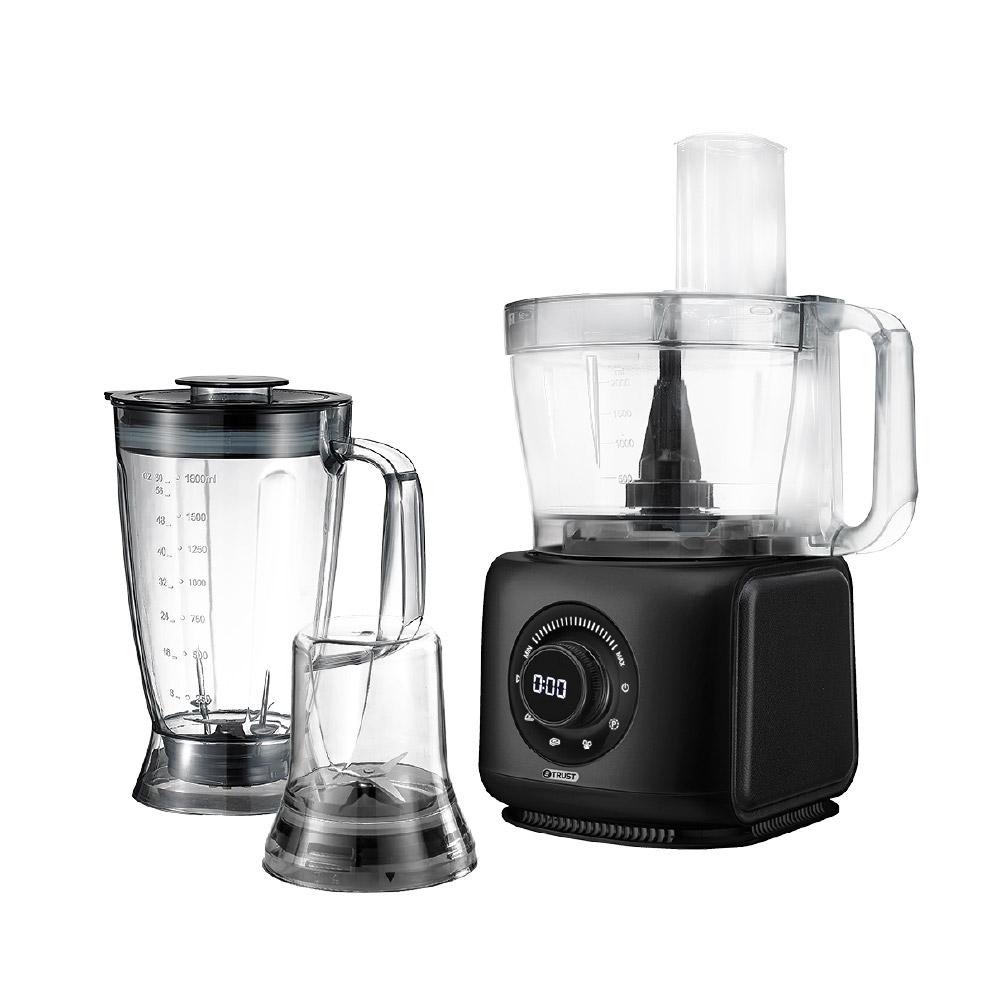 Specifications• 3.5L processing bowl.• Rotary switch with touch panel.1.8L plastic blender.250ml plastic grinder, citrus juicer.Color: plastic body with black oil painting.• 5 Stainless blades for multiple uses.220~240V, 50/60Hz, 1000W.